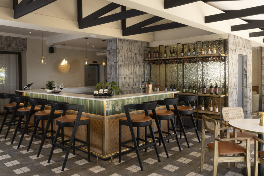 Designed for connection and comfort, the tasting room blends contemporary interiors with a seamless indoor and outdoor flow. The space is light-filled, earthy, and welcoming, accommodating up to 70 guests. Step onto the terrace and take in sweeping views across vineyards that stretch toward the iconic Table Mountain, creating one of the most scenic wine tasting spots in the region. Leafy vines form a natural canopy overhead, while surrounding farmland, tall trees, and white fences complete the tranquil Winelands atmosphere.