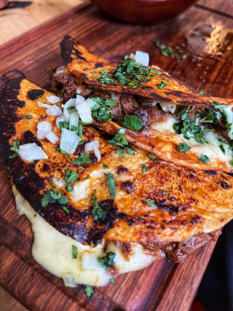 Now, let’s talk about the food. We went straight for the beef birria tacos and chicken tacos, and honestly? Life-changing. The beef birria came perfectly crispy on the outside, loaded with tender, slow-cooked beef, melted cheese, fresh onions, and herbs. And that rich, flavour-packed consommé for dipping? I could drink it by the cup. The chicken tacos were just as incredible, juicy, flavourful, and impossible to put down.
